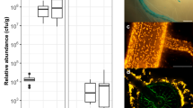 Gnotobiotic plantlets inoculated with Burkholderia Q208 (1.25 × 109 CFU/ml) were grown for 1, 5 or 15 days. Roots were washed twice with MgSol (10 mM MgSO4) and separated into non-sterilized or surface-sterilized roots. Surface sterilization was modified after Govindarajan et al.24. Briefly, roots were washed with MgSol and vortexed for 3 min under agitation in 2% sodium hypochlorite. Roots were rinsed five times for 5 min in sterile H2O, then rolled onto Luria-Bertani agar plates to verify surface sterility. Total Burkholderia Q208 dsDNA was extracted using MoBio PowerSoil DNA isolation kits following the manufacturer’s instructions (MoBio Laboratories, Carlsbad CA). Burkholderia 16S rRNA was amplified using Burkholderia-specific primers Cluster11F (5′-GAACAGAGGGTTGCCAAG-3′) and 1392R (5′-ACGGGCGGTGTGTAC-3′). Sugarcane 25S rRNA was amplified using the 25S rRNA primer pair 5′-ATAACCGCATCAGGTCTCCAAG-3′ and 5′-CCTCAGAGCCAATCCTTTTCC-3′ 25. RT-qPCR followed the protocol of Paungfoo-Lonhienne et al.26. After amplification, melting curve analysis was performed to verify uniqueness of the product. Measured Ct values were converted to relative copy-numbers by normalizing the Ct values of bacterial 16S rDNA by the Ct values of sugarcane 25S rDNA. All experiments were performed in three biological replicates, and all measurements in three technical replicates.