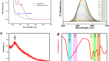The photoluminescence properties of CDs were measured by the FL-4500 fluorescence spectrometer (Hitachi, Japan). The size distribution and morphologies of CDs nanoparticles were examined by the field-emission transmission electron microscope (TEM, Tecnai G2 F20) at an accelerating voltage of 200 kV. The crystalline structures of three CDs were characterized by X-ray powder diffraction (XRD, BRUKER D8 ADVANCE), using Cu Ka (k = 1.5405 Å) as the incident radiation. The UV-visible absorption spectra was recorded by the UV spectrophotometer (Lambda35, CASCQTS-B0001, China). FTIR spectroscopy was recorded on KBr pellets with a TENSOR 27 FTIR spectrometer (Bruker) with resolution of 2 cm−1, and the X-ray photoelectron spectra (XPS) were performed on a PHI-5400 (USA) K-Alpha electron energy spectrometer with a monochromated Al Kα X-ray source (hʋ = 1,486.6 eV).