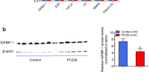 In situ hybridization was performed as previously described40. Frozen uterine sections of six vehicle control mice and eight PCOS mice (10 μm) were mounted onto 3-aminopropyltriethoxysilane (Sigma)-coated slides and fixed in 4% paraformaldehyde solution in PBS for 1 h. Hybridization was performed at 55 °C for 16 h. Then sections were incubated in anti-digoxigenin antibody conjugated to alkaline phosphatase (1:5000; Roche Applied Science). The positive signal was visualized with the buffer containing 0.4 mM 5-bromo-4-chloro-3-indolyl phosphate (Amresco) and 0.4 mM nitro blue tetrazolium (Amresco) as a dark brown color. All of the sections were counterstained with 1% methyl green. Digoxigenin-labeled sense probe for each gene was also hybridized and served as a negative control. Endogenous alkaline phosphatase activity was inhibited with 2 mM levamisole (Sigma). The whole images were performed for densitometry by ImageJ.