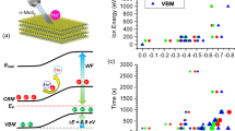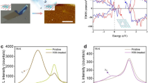 On the other hand, the calculations reveal that the 1T-3VS defect doped bilayer MoS2 in a ferromagnetic state is more stable by energy difference of 0.420 eV per formula unit (fu) than a nonmagnetic one and has a magnetic moment of 0.084 μB/Mo. Notably, the magnetic moment of the 1T-3VS defect doped monolayer is 0.168 μB/Mo. The thickness-dependent magnetic moment manifests that, compared to the calculated magnetic moments, the significantly reduced magnetic moments of the electron-irradiated samples (Fig. 1b,c) are attributed to the diamagnetic states of the subsurface layers remaining in the non-defective status. Furthermore, compared to the 1T-3VS doped monolayer, the 1T-phase doped monolayer MoS2 (Fig. 3b) is more favored by the difference of 0.328 eV per fu and has a larger magnetic moment of 0.175 μB/Mo (0.0875 μB/Mo for bilayer MoS2). However, it is notable that 1T-3VS defects were only obtained at the specific condition of 300 kGy, while the higher electron dose of 600 kGy mainly produced the 1T-phase-like defects (not shown) and induced the diamagnetic to the paramagnetic phase transition instead of the ferromagnetic phase. It is contrary to a simple consideration that the higher electron dose may produce more 1T-3VS defects than 1T-phase-like defects. Thus, the 1T-phase-like defects are considered to be closely related to the VS2-like defects33, where each Mo atom lacks six nearby S atoms (3VS2). In other words, the remained S atoms of 1T-3VS defects in Fig. 3c may be pushed away or moved further into the vdW gap at the higher electron dose. The first-principles calculations of 3VS2 (not shown) indicate that, similar to the VS2-doped monolayer MoS2, the 1 × 1 bilayer MoS2 is nonmagnetic (after removing the topmost S layer)20,21,22, and the 2 × 2 bilayer MoS2 is more likely to be antiferromagnetic than ferromagnetic (after removing the S layers at the top layer). Therefore, the undulating magnetic domains of the MFM image due to the ferromagnetic state (Fig. 1d) are considerably related to the 1T-3VS defects. More interestingly, these 1T-3VS defects can be obtained on the sliding surfaces44 and the large-area CVD trilayer-MoS2 film with the plasma treated substrate45. However, there are no 1T-phase-like or VS2-like defects on both samples. In the former case, 1T-3VS defects are simulated by rotation of the two single hexagonal lattices by a misfit angle of 30°. The calculated density of states (DOSs) of the 1T-3VS defect doped bilayer MoS2 show that the bandgap is closed at the top layer while it is open at the bottom layer (Fig. 3e). In order to investigate the bandgap change due to the electron irradiation, surface-sensitive measurements were performed. Figure 4b–d show that the x-ray photoelectron spectroscopy (XPS) spectra of the electron-irradiated sample shift toward the low binding energy side compared to those of the pristine MoS2. However, the stoichiometry of the electron-irradiated sample estimated from the respective integrated peak area of the Mo 3d and S 2p XPS core levels (Fig. 4b,c) retains the ratio (1:2) of the pristine MoS2. Deconvolution fits46 (Fig. 4b,c) elucidate that both Mo 3d (d5/2, 229.77 eV) and S 2p peaks (p3/2, 162.58 eV) of the pristine MoS2 (component C1 of the 2 H phase) are found to consist of two components after electron irradiation. The intensity ratio of C1 to C2 is estimated to be 0.5. The electron irradiation-induced peaks (component C2 of the 1T-3VS phase) are located at lower binding energies of 229.59 eV (Mo 3d5/2) and 162.29 eV (S 2p3/2), respectively. It is similar to the 1T-phase doped monolayer47. The valence-band maximum (VBM) also moves toward the Fermi energy (EF) from 0.99 eV to 0.77 eV as indicated by arrows (Fig. 4d). Notably, the influence of the oxygen, which is inevitable during the electron irradiation, is considered to be negligible from the lack of the change at the weak peak of 236.20 eV (Fig. 4b), corresponding to Mo6+ oxidation state of Mo.