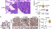 Overexpression of inflammatory cytokines is another important feature of ALI. Therefore, we measured the level of TNF-α and IL-10 in the lung tissue and BALF. LPS significantly up-regulated TNF-α mRNA level in lung tissues and protein concentration in BALF. These effects were significantly reduced by LR12 (Fig. 4a,c). LR12 also enhanced expression of anti-inflammatory cytokine IL-10 mRNA and protein triggered by LPS injection (Fig. 4b,d).