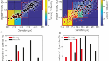 Density of the solid fraction (ρs, including closed pores) was measured using a helium pycnometer (Micrometrics AccuPyc II 1340), obtaining 2925 ± 32 kg/m3 and 2136 ± 41 kg/m3 for ETB and LSP, respectively. The density of the analysed particles was computed as ρp = ρS(1−α), assuming that measured 2-D vesicularity is representative of the actual 3-D vesicularity of the bulk particle. Mean density values of the analysed ETB and LSP samples are 2846 ± 101 kg/m3 and 764 ± 298 kg/m3, respectively, equal to vesicularity of approximately 3 and 65%. The average density of about 3 × 104 LSP particles was also measured by an independent method37, obtaining a value of 831 ± 60 kg/m3.