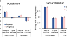 A social factor which seems to influence such fairness considerations is the group membership of the interaction partners. A growing body of studies have explored the group bias in fairness norm enforcement, but these results are inconsistent7,8,9,10,11. Some authors propose a Norm-Focused Theory, emphasize the functional role of prescriptive norms which help to maintain group cohesion and promote group interest. Accordingly, the violation of such norms will be highly salient and objectionable, violating the central compact of group life12. According to the Social Identity Theory, other researchers propose that an ingroup member’s unfair action will at least partially be compensated by the positive evaluation they gain through group membership13,14. Hence, these two theories make different predictions about punishment behaviors in intragroup interaction relative to intergroup interaction. The Norm-Focus Theory predicts that ingroup norm violators are punished more harshly than outgroup norm violators, while the Social Identity Theory predicts that ingroup norm violators are punished less harshly than outgroup norm violators. In the Ultimatum Game, both theories have been supported. A recent review of the literature appraised studies on group bias in norm enforcement and indicated that most findings are more consistent with the Social Identity Theory than the Norms-Focused Theory12.