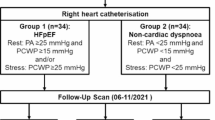 Echocardiography was performed in the left lateral decubitus position using a commercially available system (Vivid E9; GE Vingmed, Milwaukee, WI, USA). Images were obtained using a 3.5-MHz transducer in the parasternal and apical views (long-axis, 2- and 4-chamber views). Two-dimensional echocardiography measured each chamber’s dimension, volume, and wall thickness according to the recommendations of the American Society of Echocardiography16. LVEF was calculated according to the biplane Simpson’s method in apical 2 and 4-chamber views. Ratio of early (E) to late (A) transmitral velocities (E/A) and deceleration time of E velocity were obtained using pulsed-wave Doppler in the apical 4-chamber view. E’ was measured at the septal mitral annulus in the apical 4-chamber view by placing the sample volume at a sample size of 8 mm. The ratio of mitral peak velocity of early filling (E) to early diastolic mitral annular velocity (E’) (E/E’) was measured to estimate LV filling pressure17. MR severity was measured using the doppler volumetric method18 and proximal isovelocity surface area method19. When both methods could be obtained, the results were averaged, both at rest and during peak exercise. Stroke volume (SV) was calculated by multiplying LV outflow tract (LVOT) area by LVOT velocity-time integral measured using pulsed-wave doppler. Then, cardiac output (CO) was calculated as SV × heart rate. PASP was estimated based on the tricuspid regurgitation jet according to the simplified Bernoulli equation (PASP = 4 × v2 + right atrial pressure), in which “v” is peak velocity of the tricuspid regurgitation jet (m/s), and right atrial pressure is estimated from the diameter and breath-induced variability of the inferior vena cava20. These conventional echocardiographic parameters were collected at rest and during peak exercise, respectively.