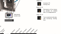 Each monkey was trained in an operant conditioning box (45 × 45 × 60 cm) located in a dark, sound-attenuated room with a continuous white noise. The front wall of the box had an opening. A 21.5-inch touch-sensitive LCD screen (1920 × 1080 pixel display resolution), used for stimulus presentation, was mounted on the front panel of the box. A food dispenser delivered a piece of sweet potato through a tube into a food cup mounted on the bottom of the front wall of the box. The room was illuminated during each session by a ceiling-mounted house light. USB I/O interfaces controlled the house light and feeder, and Visual C# (Microsoft, 2010) generated the stimuli and controlled the experimental procedure. The apparatus used in the human experiment was identical to that used in the pilot study (see Supplementary information).