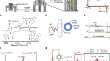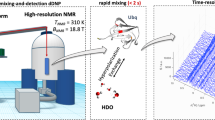 Tris{8-carboxyl-2,2,6,6-tetra[2-(1-hydroxyethyl)]-benzo(1,2-d:4,5-d′)bis(1,3)dithiole-4-yl}methyl sodium salt (Ox63 radical, GE Healthcare) and the 15N-labelled sample were dissolved in a 1:1 solution of D2O (99.9%, D):dimethyl sulfoxide-d6 (99.8%, D) (final concentration of Ox63 10–15 mM). The sample was submerged in liquid helium in a DNP polarizer magnet (3.35 T) (HyperSense, Oxford Instruments). The transfer of polarization from the electron spin on the radical to the 15N nuclear spin on the probe was achieved using microwave irradiation at 94 GHz and 100 mW under 2.8 mbar at 1.4 K. After polarization, samples were dissolved in D2O containing 0.025% EDTA disodium salt or an appropriate buffer heated to ~185 °C (pressurized to 10 bar)18. The DNP-NMR measurement was performed using a Japan Redox JXI-400Z spectrometer (9.4 T).