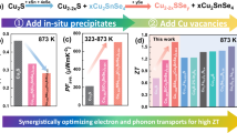 Polycrystalline Cu1.98SxSe1−x pellets were synthesized by a conventional solid-state method. Mixtures of Cu, S, and Se powders in the molar ratios of 1.98 : x : 1 − x (x = 0, 0.02, 0.08, 0.16, 0.2, 0.3, 0.4, 0.5, 0.6, 0.7 0.8, 0.9, 1.0) were pressed into pellets and sealed in evacuated quartz tubes, then heated to 873 K for 1–5 hours with a heating rate of 5 K/min, followed by a furnace cooling to room temperature. Finally, the as-sintered pellets were used in a melt-solidification approach to achieve highly dense polycrystalline bulks, which has been described in detail in our previous work19,21. The obtained polycrystalline bulks were then shaped into round disks and rectangular bulks for electrical conductivity and thermal diffusivity measurements, respectively.