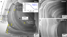 The YTT whole rock and pumice samples were crushed, sieved, cleaned and picked for pristine quartz, feldspar, biotite and amphibole. For CL characterisation, quartz grains were mounted in epoxy resin and analysed with a CL detector attached to a JEOL microprobe at the Department of Earth Sciences at Bristol University. Whole rock powders were analysed for oxygen isotopes using a conventional line and mineral grains by using a laser fluorination line at the University of Cape Town. For SIMS analysis, quartz crystals were fixed in epoxy mounts and coated with gold. In-situ O-isotope measurements were made using a CAMECA IMS 1280 SIMS instrument at the Swedish Museum of Natural History, Stockholm (NordSIM). A 20 keV Cs+ primary beam of ca. 2.5 nA was used in critically-focussed mode together with a 5 μm raster to sputter a ca. 10 μm sample area. The runs comprised a 90 second pre-sputter period with a raster of 20 μm, and field aperture centering using the 16O signal followed by 64 seconds of data acquisition using two Faraday detectors in the multicollector system operating a common mass resolution of ca. 2500. Corrections for instrumental mass fractionation were determined using international reference material NBS-28 (silica sand), with further details given in refs 60 and 61. Full descriptions of all methods employed, including for Sr-, Nd-, and He-isotope analyses, are provided in the Supplementary Information.