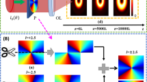 To experimentally verify the mode-splitting of optical OAM state predicted by our simulation, we measured the intensity distribution of the z-component electric field in the focal plane for the aforementioned vector-vortex beams (see Method for the details of the generation of the beams). The measurements were performed with a new method introduced in ref. 59, which employs a nanoparticle-on-film structure as a near-field probe that is sensitive to the out-of-plane field. The experimental results [Fig. 2d,e] are in excellent agreement with the calculated longitudinal field components [Fig. 2a–c], thus validating the realibility of our analytical model. Their cross-section comparisons along the x-axis for the three beams are plotted in Fig. 2g,h for a clear demonstration. More importantly, the experiment reveals the mode-splitting of optical OAM state controlled by the incident polarization under a high NA optical microscopy system.