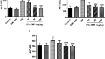 Liver was identified as one of the main target organs for toxicity mediated by CYA49, QCT50 and MEQ11. MEQ induced disorganized hepatic cord patterning, cellular swelling and centrilobular liver cell necrosis in Wistar rats11. The altered levels of ALB, ALT, ALP and AST indicate chronic liver disease11,49. In the present study, a significant reduction in body weight and a significant increase in the liver coefficients were observed (Fig. 2). The histopathological evaluation showed marked liver damage, including extensive proliferation of the bile duct epithelium, and neutrophilic infiltrate within and around the bile duct. In biochemical analysis, MEQ–mediated increase in serum ALP exhibited disrupted plasma membrane bilayer and then resulted in efflux of serum ALT (cytosolic) and AST (mitochondrial). These results were consistent with previous reports suggesting that liver damage occurs after sub-chronic oral administration of MEQ in Wistar rats11,21,29.