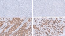 TMAs were deparaffinized, rehydrated in serial ethanol baths (100%, 90%, 75%, 50%) and then placed in citrate buffer (pH 6.0) in a pressure cooker at 15 psi for 30 min for antigen retrieval. nKIFC1 was immunostained at 1:1000 dilution in the corresponding author’s lab using rabbit polyclonal antibody, which was graciously provided by Dr. Claire Walczak (Indiana University)25. Enzymatic detection of the antibody was performed using the Universal LSAB2 Kit/HRP, Rabbit/Mouse (Dako, CA, US). A panel of potential breast cancer biomarkers (Androgen Receptor; Cytokeratins 5, 7, 8, 14, 18, and 19; CD44, c-Kit; Epidermal Growth Factor Receptor; Insulin-like Growth Factor Receptor; Ki67; Melatonin Receptor; p53; p63; P-cadherin; Survivin [nuclear]; Topoisomerase; Urokinase Receptor [nuclear]; Vimentin; and Zeb) had been previously immunostained26. Biomarkers were centrally reviewed and scored by the same two independent pathologists who were blind to clinical annotation. Scoring was performed for both the intensity of staining (0 = none, 1 = low, 2 = moderate, 3 = high) and the percentage of cells with any positivity (i.e., staining of 1+), and the average of the two pathologists’ scores were taken. WIs were calculated as the product of the staining intensity and percentage of positive cells. Representative images of nKIFC1 staining are provided in Fig. 1.