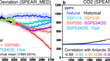 Around much of Antarctica, variability in sea ice concentration and the timing of annual sea ice advance (and retreat) is linked with variability in wind patterns as they affect both sea ice dynamic and thermodynamic processes. While cold southerly winds tend to drive enhanced equatorward ice advance and (depending on the season) increase the ice concentration, warmer northerly winds can compact the sea ice35,36,37,38,39,40. In East Antarctica, recent analyses have shown that changes in sea ice contain a strong wind-driven thermodynamic component39. Coupled sea ice model experiments depict a strong, non-annular response of wind-induced sea ice drift in East Antarctica, with strong westerlies leading to increased sea ice concentration in the western part of this region while further east, a strong northerly wind results in decreased sea ice concentration40. Aspects of these winds and sea ice changes are associated with trends in large-scale climate modes of variability such as the Southern Annular Mode (SAM)35,40,41,42, which itself is forced by the Southern Hemisphere ozone hole and increased greenhouse gases38,43.