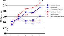 In order to rule out that the sprint interval training led to a deviation from the physiological development, all mice were weighed at entry into the familiarization phase and every week thereafter. Comparison to age and sex matched non-trained controls confirmed that the trained mice developed normally and gained weight like the controls. It was only during the last week of training, that the increase in weight observed for non-trained controls decelerated for the trained females (Fig. 4). Trained and non-trained controls did not show any overt differences in stature.