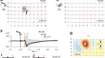 Previous behavioral studies have reported that frequency perception is not consistent when the sound intensity changes25,26,27. Sound perception is based on neuronal activity in the auditory cortex1. Therefore, we asked whether the frequency preferences of auditory cortical neurons would change with the stimulus intensity. We first conducted in vivo multiunit extracellular recordings between 420 μm to 450 μm, which corresponds to L4 in A1, in anesthetized rats (Fig. 1A, see the Methods for details) to obtain the TRFs of neuronal ensembles. We used a micromanipulator to monitor the position of the electrode and we further confirmed the depth after some experiments (Fig. 1A). The TRF is composed of the responses evoked by 568 short pure tones (0.5–64 kHz, 0.1-octave step; 0–70 dB, 10 dB step, 35 ms duration with 5 ms cosine ramp). The BF represents the frequency that evokes the highest firing rate of the neuronal ensembles28. The CF equals the BF at the threshold intensity level. The frequency preferences of the entire A1 region can be mapped based on the CF of each recording site, producing what is known as a tonotopic map (Fig. 1B). At each recording site, the evoked responses can be detected as the average activity of the local neuronal ensembles. Fig. 1C shows three examples of recorded responses at sites with low, medium and high CFs. We can see that the BF is not consistent and shifts either leftward or rightward with the increasing intensity. We also observed a similar shift pattern in the A1 region of awake rats (Fig. 1D).