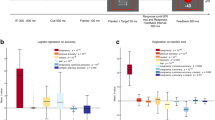 Electroencephalograms (EEGs) were recorded using a BrainAmps system (Brain Products, Munchen, Germany) from 64 scalp sites according to the 10–20 system positions with a reference at FCz51. A common average reference was recalculated. Vertical electrooculograms (EOGs) were recorded using electrodes placed below the right eye. Horizontal EOGs were recorded from the right orbital rim. Electrode impedance was maintained below 5 kΩ. Both EEG and EOG activities were amplified using a DC-100-Hz bandpass filter and continuously sampled at 500 Hz/channel for off-line analysis.
