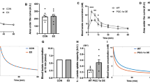 Blood lactate levels during exercise are associated with the ratio between lactate production and clearance17,18. Therefore, blood lactate levels are strongly linked to exercise performance. To examine the effect of Cy3G on exercise performance (swim until exhaustion with a load corresponding to 10% of their body weight), mice were given Cy3G or water (control) orally for 15 days and were made to perform exercise (Supplementary Fig. S1). Blood lactate levels were measured on day 13 (10 min swimming) and day 15 (swimming until exhaustion) before and after the swimming exercise. Results showed that before performing exercise, the blood lactate levels were not statistically different between the control group and Cy3G-treated group (Fig. 1A and C). However, after exercise, as shown in Fig. 1A and C, the elevation of lactate was significantly lower in the Cy3G group on Day 13 (10.7 mM vs. 7.2 mM, P = 0.02) and Day 15 (12.6 mM vs. 8.0 mM, P < 0.01) compared to the control group. Additionally, the Cy3G group’s high glucose levels were maintained after exercise on Day 13 (136 mg/dL vs. 181 mg/dl, P = 0.02) and Day 15 (152 mg/dL vs. 178 mg/dl, P = 0.01) (Fig. 1B and D). Furthermore, as shown in Fig. 1E, Cy3G-administered mice did not get exhausted as fast as the control group as shown by the increased time to exhaustion (230 s vs. 377 s, P = 0.02). The blood levels of urea nitrogen, creatinine, and total ketone bodies were then evaluated since these parameters are normally increased after exercise19,20. Cy3G-administered mice had lower levels of these biochemical components compared to control (Table 1: Urea nitrogen: 28.4 mg/dL vs. 22.2 mg/dL, P = 0.05, Creatinine: 0.20 mg/dL vs. 0.12 mg/dL, P = 0.02, Total ketone bodies: 1282.0 μM vs. 847.8 μM, P ≤ 0.01). Moreover, Cy3G-administered mice had increased gastrocnemius weight (0.23 g vs. 0.29 g, P = 0.04) and protein content (91.2 μg/mg vs. 96.9 μg/mg, P < 0.01) compared to control (Table 2 and Supplementary Table S1). The animals in three groups consumed on average the same amount of food (Table 2).