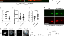 We analysed the shapes and spatial localisations of the OPN-labelled profiles within the affected striatum 14 days post-lesion using FIB-SEM. Morphological tracing and 3D reconstruction were performed in all 234 consecutive sections, which had a total thickness of about 14 microns. We identified 47 OPN-positive structures with a mean volume of 0.52 ± 0.11 μm3 in this reconstructed volume. These structures appeared to be randomly distributed within the lesion (Fig. 6a). The shapes and sizes of the OPN-positive structures were variable; some were associated with mitochondria (Fig. 6b). For a detailed analysis of the spatial relationships between the OPN staining pattern and the somatodendritic domains, we traced individual OPN-positive structures and linked them back to the parent dendrites using a series of more than 60 consecutive sections. Three-dimensional reconstruction of some OPN-positive neurites revealed that they appeared to directly extend onto the larger dendrites that were negative for OPN (Fig. 6c–f). These data indicate that OPN-labelled structures are in direct contract with parent dendrites rather than fragmented debris originating from them.