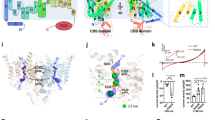 Many of the EVcoupling pairs could be confirmed in the available structural models, supporting the validity of the approach. Two evolutionary coupled pairs of residues (K96:N102 and N34:E43) were located in the regulatory domain, and their relative positions and interactions could be confirmed in the crystal structure (Supplementary Fig. 8c and d)12. Another four of the evolutionary coupled pairs of residues were located in the carrier domain (I435:L443, E438:R445, F238:L250 and F238:V424), and these interactions were consistent with the comparative homology model of the carrier domain (Supplementary Fig. 8e and f)16. The remaining 14 interacting pairs were located at the end of the amphipathic α-helix, in the linker-loop and at the N-termini of the first transmembrane helix of the carrier domain. The constraints supplied by the evolutionary coupling data allowed us to construct a model for the linker-loop region (Supplementary Fig. 8a and b). We noted that there were no co-evolved pairs between the regulatory domain and the carrier domain (Supplementary Fig. 8). Thus it appears that the regulatory domain interacts with the carrier domain via the linker-loop region, which would allow both domains to move independently of each other. It also shows that the linker-loop region is a key component of the overall structural stability of the transporter in agreement with the truncation analysis (Fig. 2). Given the lack of constraints, it was not possible to determine the lateral position of the regulatory domain relative to the carrier domain, but the constraints provided by the compact linker-loop domain did restrain the orientation of the regulatory domain relative to the carrier domain. A number of regulatory domain positions were modeled, and the highest scoring one was used, but all are in agreement with the locking pin mechanism (Supplementary Fig. 8a and b).