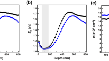 with Eg,i being the band gap energy of the i-th layer (with Eg,1 = Eg,min and Eg,m = Eg,min + dEg, where dEg is the difference between the smallest and the highest band gap energy). Each layer is weighted by , since the influence of the gallium concentration on B is negligible15. The distribution of band gaps of a typical CIGS absorber can be well described with a simple square like distribution, whose width increases over time due to the slow diffusion of Ga compared to In during the 2nd stage of the deposition process. The developing band gap gradient, ΔEg, cannot be obtained from the fit to the absorption coefficient since the layers with the lowest band gap energy Eg,min dominate the transmission through the film (Fig. 2b). Within this model the gallium gradient is assumed to be linear over the sample depth with a slope increasing linearly over time from zero at the beginning of stage 2 until 0.075 eV/μm at the end of stage 2. The evolution of the CIGS 112 XRD peak width allows an approximation, but still an error of 40% is assumed. Fortunately the Ga gradient has only little influence on the sub-gap tail energy, an error of 40% of the Ga gradient induces a relative error of 0.4% to the sub-gap tail energy. The relative error of the minimum band gap energy is increased by 2.2%. The main source of error comes from the simplified refractive index. Assuming a relative error of 5% of the refractive index, the relative error of the layer thickness becomes 5%, of the surface roughness 3.4%, of the calculated minimum band gap only 0.3%, but the error of the sub-gap defect energy becomes 7.4%.