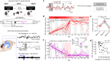 Figure 1a shows the CV during spontaneous activity in the rat’s primary visual cortex, sampled in intervals of 200 μm along a line parallel to the antero-posterior axis (see Materials and Methods for details). A correlated spiking variability level across pairs of local neuronal networks was observed throughout the experiments (>3600 s; more examples in Fig. S1). The decrease in the amount of spiking correlation between neocortical neuronal pairs as the distance between those neurons increases throughout distances of 200 and 1000 μm is well known29,32. In addition, Fig. 1b (top) shows strong, stable and significant (all p-values < 0.01) correlated spiking variability levels in the primary visual cortex23. By contrast, the correlated spiking variability was not significant when all spike times were replaced by the corresponding Poisson’s equivalent spike trains (identical firing rates; all p-values > 0.1). Moreover, the occasional spiking variability decoupling among neuronal populations (arrows in Fig. 1a) shows that those high levels of variability coupling may sporadically drop down (quantification in Fig. 1a and in Fig. S2). Figure 1c illustrates the underlying neuronal activity across the primary cortical populations during spontaneous activity during periods of high and low levels of variability for the (top) wideband local field potential, (middle) raw spiking activity, and (bottom) population firing rate. Different levels of spiking variability imply spiking correlation structure. Panels d and e in Fig. 1 show them calculated during two 300 s long periods of high and low levels of variability, respectively. This is confirmed in the scatter plot of the average CV versus the mean spiking correlation within independent 300 s long periods throughout the whole experiment (Fig. 1f; adjusted R2 = 0.94, n = 23).