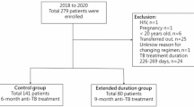 Our standard regimens under direct observation were HRZE or isoniazid, rifampicin, and ethambutol (HRE) for the first two months followed by combination therapy with isoniazid and rifampicin8. We usually selected the HRZE regimen, but the HRE regimen was used for patients at high risk of drug-induced liver injury based on the judgement of physicians12. The dosages of medications were as follows: isoniazid 5 mg/kg/day (maximum 300 mg/day), rifampicin 10 mg/kg/day (maximum 600 mg/day), pyrazinamide 25 mg/kg/day (maximum 1500 mg/day), and ethambutol 15–20 mg/kg/day (maximum 750 mg/day)8. These maximum dosage were recommended by The Japanese Society for Tuberculosis. All the regimens were provided as daily regimens.
