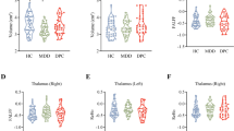 In the MDD group, the right posterior thalamus showed increased connectivity with dorsal insula. Specifically, this region lied within the medial dorsal nucleus and spanned from ventromedial to the pulvinar nuclei in the anterior-posterior direction. MDD has been associated with abnormalities within thalamus,55, 56, 57 particularly, within mediodorsal thalamus58 and pulvinar.13 The region of the thalamus observed in our study is known to project to the anterior agranular insula40, 59 and to the anterior cingulate44 and is highly interconnected with the amygdala.60 The pulvinar shows similar anatomical connections to amygdala61, 62 and the anterior cingulate.63 These connections are believed to relay salient emotional information about the environment to the limbic system.64 Strong functional connections between the AI and the thalamus65 are consistent with the cytoarchitecture and paralimbic emotional salience processing.66 Therefore, the heightened connectivity between dorsal insula and the thalamus during anticipation of pain in MDD points to increased bottom-up emotional response to aversive stimulation in this disorder. This fits recent findings showing that increased activation within rAI and this region of the thalamus was modulated by anxiety sensitivity during threat anticipation.67 Increased connectivity between dorsal insula and dorsal MPFC observed in the MDD group further strengthens this interpretation. Specifically, recent reviews of functional neuroimaging studies on fear conditioning attributed activation within MPFC to conscious appraisal of threat68 or expression of fear and anxiety.69 Therefore, increased connectivity between dorsal insula and MPFC in the MDD subjects during pain anticipation observed here was likely related to the initial response formation to the pain cue. Alternatively, increased bottom-up (that is, thalamic) response in MDD could, in part, be counterbalanced by greater top-down response within MPFC; this could potentially explain the lack of significant between-group difference in dorsal insula in our study. Taken together, the co-occurrence of the increased bottom-up and reduced top-down regulation during anticipation of pain that we observed here may underlie heightened somatic complaints70 and increased negative biasing71 in MDD.