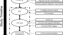 The subjective measures included the Drug Effects Questionnaire (DEQ), the Brief Questionnaire on Smoking Urges (BQSU), the Minnesota Nicotine Withdrawal Scale (MNWS) and the Positive and Negative Affect Schedule (PANAS). The DEQ was used to measure acute effects from IV nicotine and consisted of 10 items: drug strength, high, feel stimulated, good effects, bad effects, anxious, sedated, feel down, want more drug and like drug. Smokers rated each item on a visual analog (Likert) scale, from ‘not at all’ to ‘extremely.’ The DEQ was given at 1, 3, 5, 8, 10 and 15 min after the saline and nicotine administration. The BQSU is a 10-item scale originally developed by Tiffany and Drobes.35, 36 Smokers were asked how strongly they agreed or disagreed with items on a seven-point Likert scale. This scale has been found to be highly reliable in reflecting nicotine deprivation levels.37, 38 The MNWS measures withdrawal symptoms from tobacco and includes items to assess cigarette craving, irritability/anger, anxiety, difficulty concentrating, restlessness, increased appetite, depressed or sad mood, and insomnia.39, 40 The PANAS is a 20-item scale, which assesses both negative and positive affective states.41 The BQSU, MNWS and PANAS were administered before and after the session.