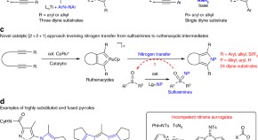 Cycloadditions involving nitrene transfer provide a useful route to valuable substituted pyrroles. Here the authors report a ruthenium-catalysed [2+2+1] cycloaddition of diynes using sulfoximines as unusual nitrogen transfer reagents.