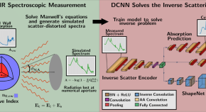 Infrared spectroscopy-based diffraction tomography has a high potential to be used for 3D reconstruction of intact samples, however, the inverse problem is highly non-linear and remains challenging. Here, the authors solve full-wave inverse scattering problems using deep convolutional neural networks and perform 3D spectral reconstruction by diffraction tomography from scatter-distorted IR spectra.