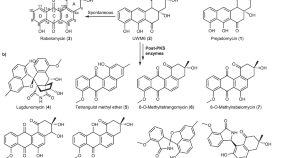 Angucyclines are a class of natural products that harbor unusual structural rearrangements through B- or C-ring cleavage of their tetracyclic backbone, however, the enzymes leading to C-ring cleavage remain poorly understood. Here, the authors use targeted gene deletion and complementation as well as metabolomics to study the function of putative oxygenases involved in lugdunomycin biosynthesis, and reveal their potential roles towards C-ring cleavage.
