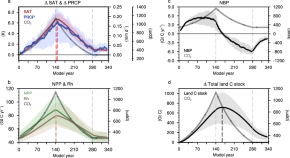 Lagged responses of the terrestrial carbon cycle to atmospheric carbon dioxide concentration may enhance climate change mitigation for decades after net-zero emission targets are met, according to analyses of simulations from an ensemble of CMIP6 Earth system models