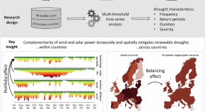 Temporal and spatial complementarities between wind and solar power strongly reduce the frequency, duration, and severity of Europe’s variable renewable energy droughts, according to a 38-year, multi-threshold analysis.