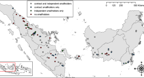 Independent smallholder farmers without exclusive contracts with specific mills were underrepresented at certified palm oil mills, and they contributed one-third of regional oil palm production, according to an analysis using a conceptual model of market participation and palm oil data.