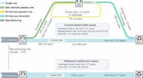 Circular devices extend use by 40% and cut individual carbon footprint by 34%. A stock-and-flow model using survey data and lifetime estimates shows that at 25% adoption, manufacturing demand and emissions dropped 15% and 14%, and by one-third if reuse becomes the norm.