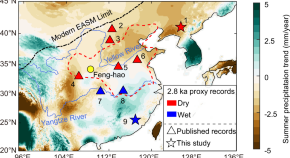 Drought and cold in northern China during the 2.8 ka cold event contributed to the collapse of the Western Zhou Dynasty and subsequent significant southward migration, according to analyses of stalagmite records from Northeast and Southeast China.
