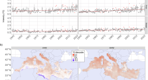 Climate change has increased the frequency and intensity of temperature extremes, especially in the Mediterranean, where the concurrence of marine and atmospheric heatwaves amplifies marine heatwave intensity, while atmospheric heatwaves show no significant changes, according to a spatiotemporal approach to heatwave detection.