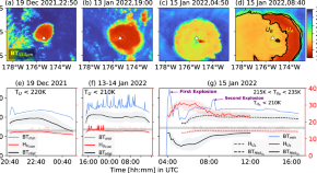 The 2022 Hunga Tonga-Hunga Ha’apai eruption involved multiple eruptive pulses and ice-rich umbrella plumes which dispersed at altitudes up to 31 km, according to satellite remote sensing observations.