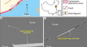 The transition of gold nanoparticles to gold-bearing veinlets could occur by solid-state pipe-diffusion and elemental migration from the interior of pyrite grains to the surfaces, according to direct observations and density functional theory calculations