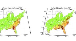 The magnitude and frequency of extreme tropical cyclone precipitation has increased in the southeastern US between 1948 and 2019, and population exposure has been exacerbated by development in some hotspots, suggest observational data on precipitation, combined with a social exposure index.