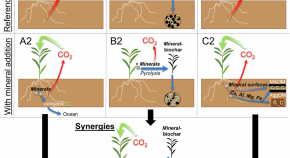 Soil-based carbon dioxide removal approaches that make use of primary and secondary minerals can create synergies between inorganic carbon, soil organic carbon, and stable biochar carbon formation.