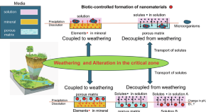 The formation of nanomaterials in aqueous fluids can be explained by four different pathways: formation by biotic and abiotic processes, coupled and decoupled with weathering processes. In the Earth’s critical zone, these pathways can be classified into 18 subcategories based on the surrounding environment.
