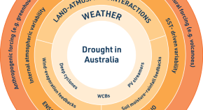 Australia experiences meteorological droughts due to insufficient moisture transport and heavy precipitation, which are influenced by climate variability and land processes, and are expected to become longer and more frequent, according to a review of observational and model-based studies.