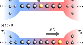 Spin caloritronics exploits the effect of temperature on spin currents with a focus on features such as spin dependent thermal conductance, which are ideally suited for next generation spintronic devices. Here, the authors theoretically investigate a cold atom simulator of spin caloritronics comprising a one-dimensional spin chain between two temperature reservoirs and consider the dynamics of a spin impurity (spin flip) introduced into the chain.