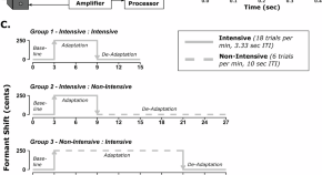 Speech auditory-motor adaptation to a formant-shift perturbation and de-adaptation after the perturbation is removed both depend more on total amount of time spent in the corresponding environment than on the number of practice trials.