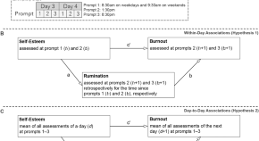 Across a four-week ecological momentary assessment with university students, between-subject and reciprocal within-subject associations between self-esteem and burnout symptoms occurred, which were partly mediated by repetitive negative thinking.