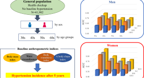 A total of 41,902 participants from health checkup programs were stratified by gender and age to investigate the association between baseline anthropometric indices and hypertension incidence over a 5-year period. BMI, WC, and BRI were almost equally effective and showed a better association with risk of developing hypertension in women and young adults compared to men and old adults. Conversely, ABSI showed no greater association than BMI or WC in any age group in both men and women. ABSI, a body shape index; AUC, area under the curve from receiver operating characteristic curve analysis; BMI, body mass index; BRI, body roundness index; WC, waist circumference.