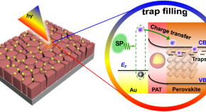 The incorporation of plasmonic core-shell nanostructures at the grain boundaries of perovskite films reduces the charge recombination loss through photo-brightening of trap states.