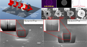 Holes of 10–30 nm in diameter are produced on sapphire with a depth to width aspect ratio of over 16 and a zero taper with a single pulse longitudinal field.
