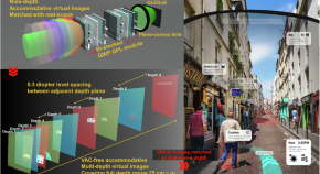 Schematic representation of nine-depth accommodative virtual images spanning the full perceivable depth range without inducing vergence–accommodation conflict (VAC), achieved using a bi-stacked quarter-waveplate geometric phase lens (QWP GPL) module. A conceptual illustration of VAC-resolved XR operation is also provided, demonstrating the ideal alignment between virtual image planes and real-world scene depths under intended system behavior.