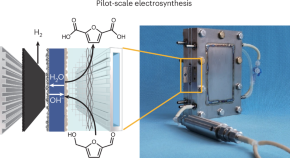 Aqueous electroconversion of biomass derivatives to polymer precursors has been demonstrated at the laboratory scale with low yield. Here a solid polymer electrolyte reactor is engineered to limit side reactions, yielding a high rate and and a high product concentration in a 4.3-kW pilot-scale platform.